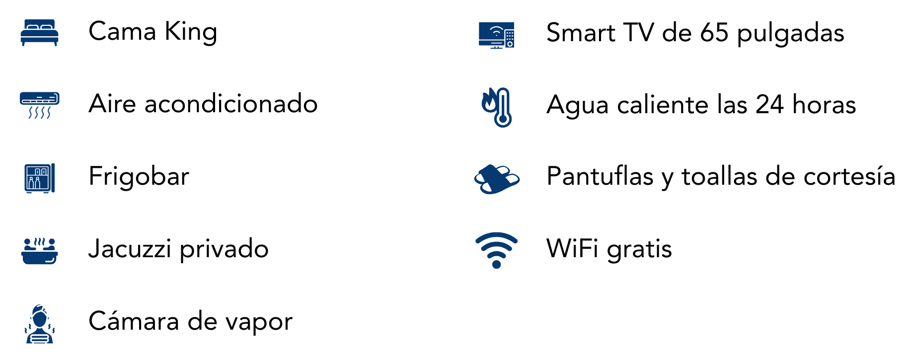 Jacuzzi con hidromasajes: Finaliza tu recorrido sumergiéndote en burbujas relajantes que masajean y rejuvenecen tu cuerpo.